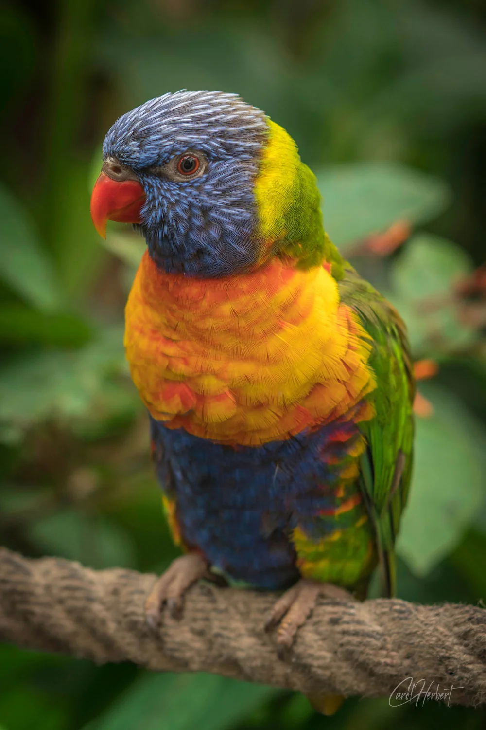 This image presents a full-body view of this vibrant bird perched on a rope. The lorikeet’s bright plumage, with its stunning blend of colours, contrasts beautifully against the blurred green background.