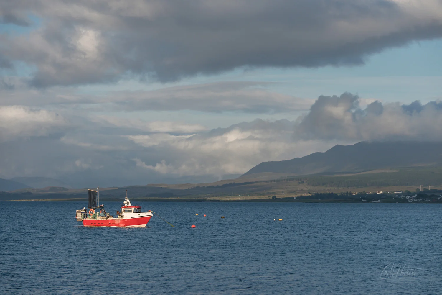 A small fishing trawler anchored in Broadford Bay, Isle of Skye, Scottish Highlands.
