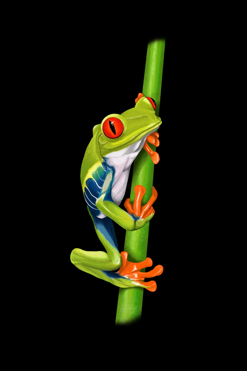 Drawing of a Red-Eyed Tree Frog on a stem.